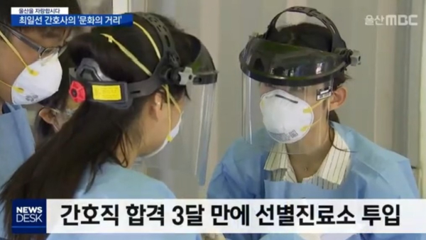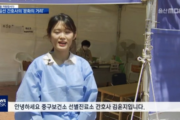 지난해 11월, 간호직 공무원시험 합격 후 울산광역시 중구보건소에 발령 받은 김윤지 간호사가 울산 MBC 연중 캠페인 ‘울산을 자랑합시다’ 에 출연하였다. 김윤지 간호사는 보건소 치매예방관리업무 수행 중 코로나19 지역사회 확산으로 2월부터는 선별진료소 운영업무에 전담하고 있다. 선별진료소 운영 초기 음압텐트를 시작으로 승차진료형(DT) 운영및 현재의 도보이동형(WT) 선별진료소까지 전담 보건간호사로서 지역사회 감염병 예방을 위해 중요한 역할을 하고 있다.
